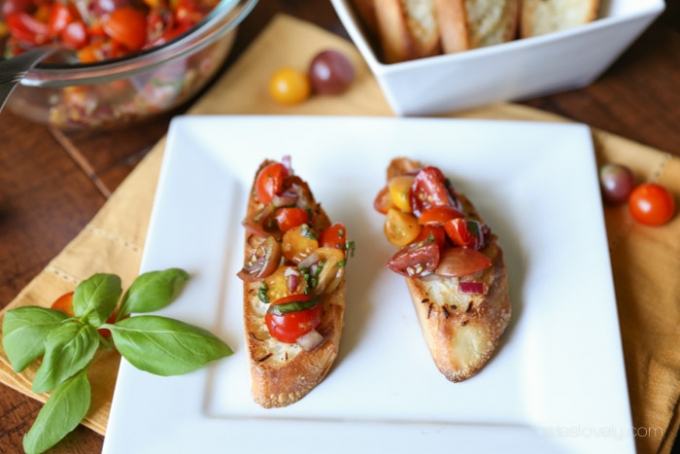 Roșiile, ceapa și frunzele de busuioc se combină într-un bol.