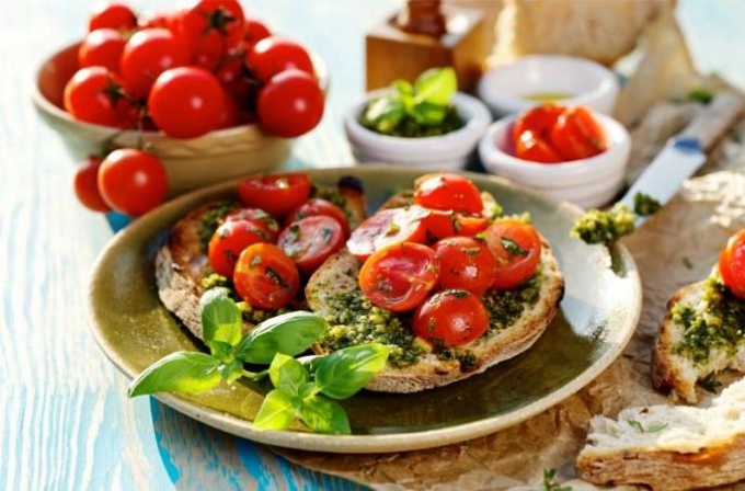 Prajeste feliile de paine pe plita sau intr-o tigaie incinsa, unge-le cu pesto si pune deasupra salata de rosii.