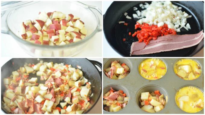 Intr-o tigaie cu ulei incins se caleste ceapa, ardeiul gras si usturoiul, aproximativ 5 minute. Tigaia se retrage de pe foc, se adauga cartofii, barnza si baconul. Toate ingredientele se amesteca.