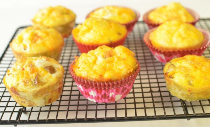 O tava pentru briose se unge cu ulei, se umple cu amestecul din tigaie, deasupra se toarna oul batut.