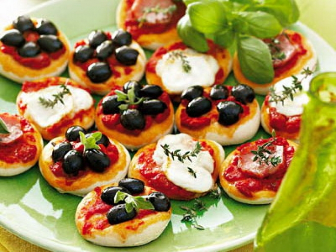 Mini pizza cu mozzarella, masline si sunca