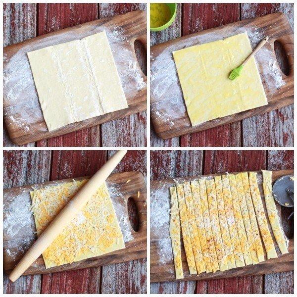 Foaia de aluat se intinde pe o masa infainata, se condimenteaza, se unge cu ou batut si se presara cu cascaval. Se intinde un pic cu facaletul, apoi se taie fasii late de aproximativ 2 cm.