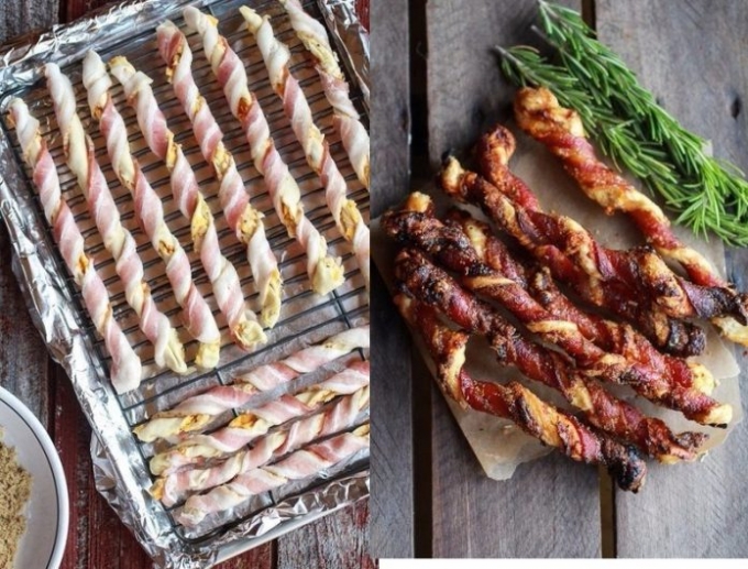 Fiecare fasie de aluat se inveleste cu bacon si se aranjeaza pe o tava tapetata cu folie de aluminiu.