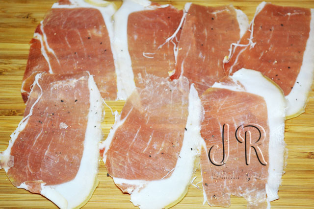 Feliile de prosciutto le condimentam putin cu piper negru, proaspat macinat (sare nu se foloseste in aceasta reteta).