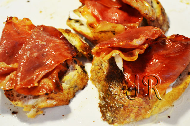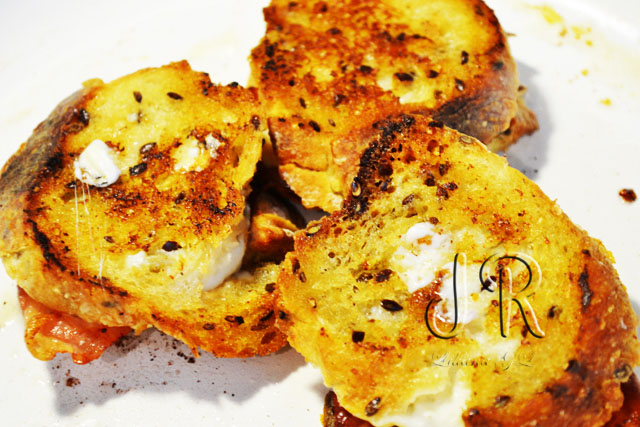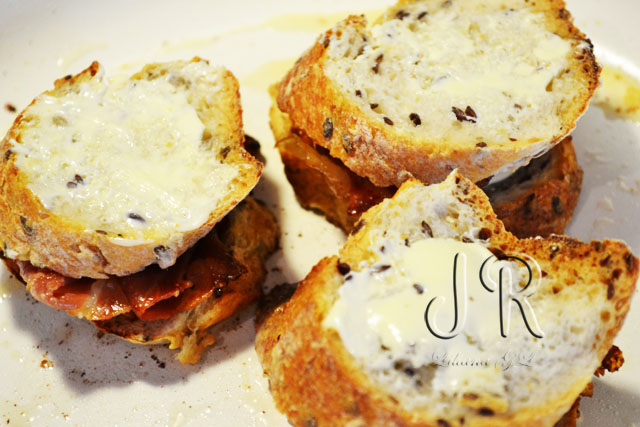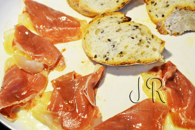 Adaugam feliile de prosciutto si painea unsa cu unt. Painea o aranjam pe tigaie cu untul in jos. Se prajeste la foc mic timp de 2 minute.