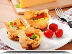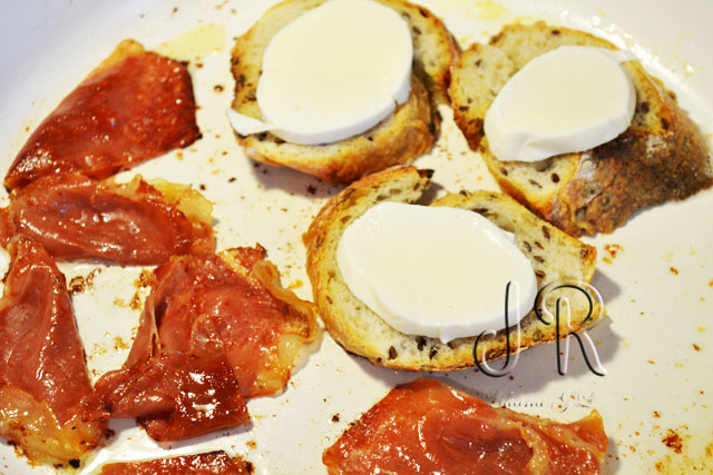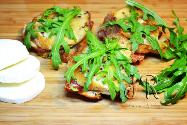 Cand feliile de prosciutto s-au rumenit, le aranjam peste mozzarella.