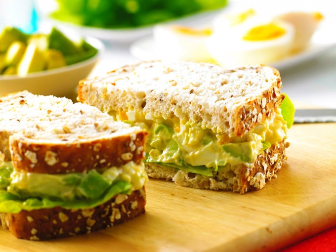 Pe o felie de paine se aranjeaza o frunza de salata, se adauga amestecul de ou si avocado, iar deasupra se pune o alta felie de paine.