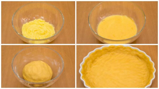Într-o formă de copt, unsă cu unt, se întinde uniform aluatul.