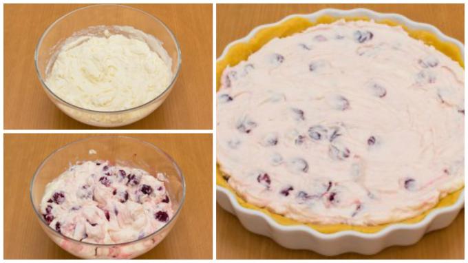 Într-un bol se combină brânza de vaci cu smântână, se adaugă zahărul și vișinele. Toate ingredientele se amestecă. Umplutura obținută se toarnă peste aluat și se netezește.