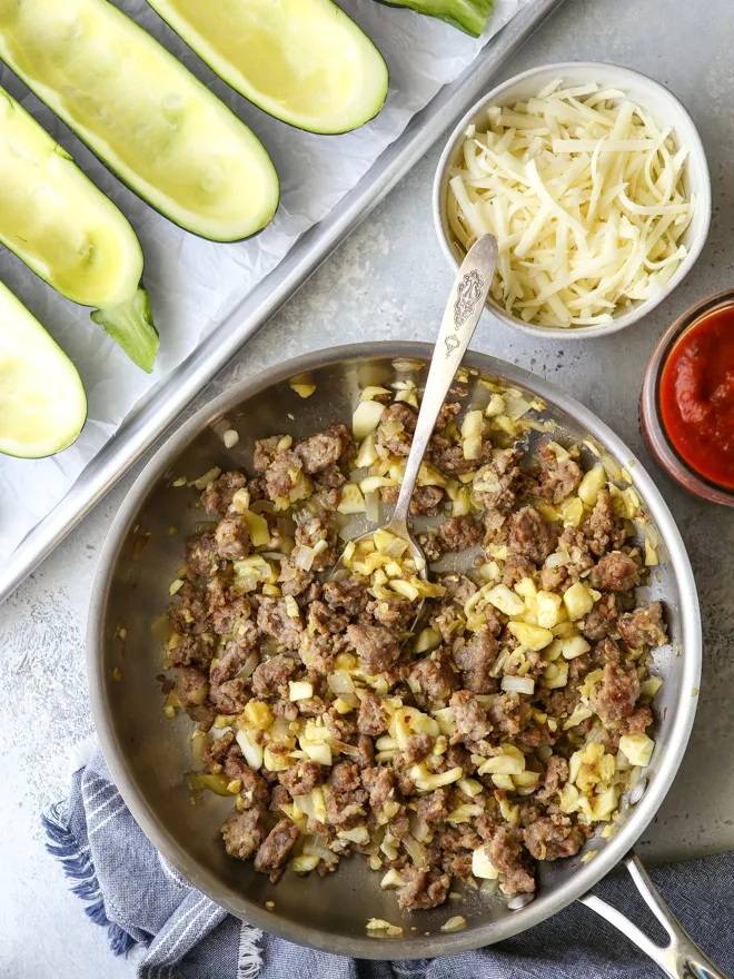 Rumeniți cârnații pentru câteva minute, apoi adăugați ceapa, usturoiul și dovlecelul tocat, și gătiți până când cârnații sunt gata și legumele fragede.