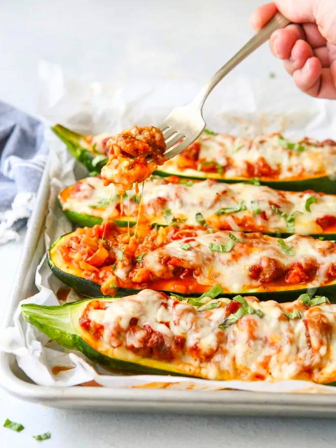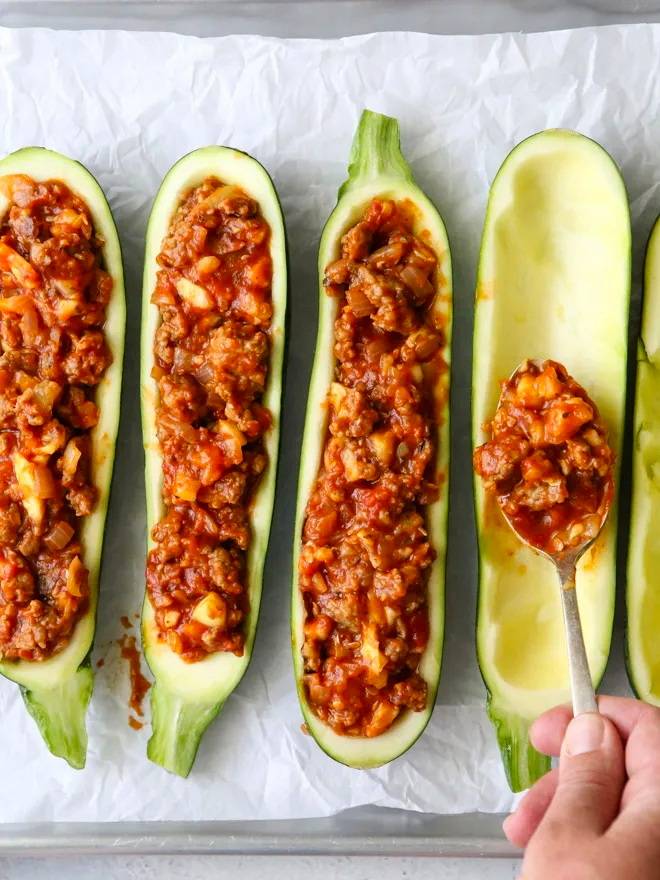 Bărcile de dovlecei se coc pe o tava tapetată cu hârtie de cop până când mozzarella se topește, aproximativ 15-20 de minute.
