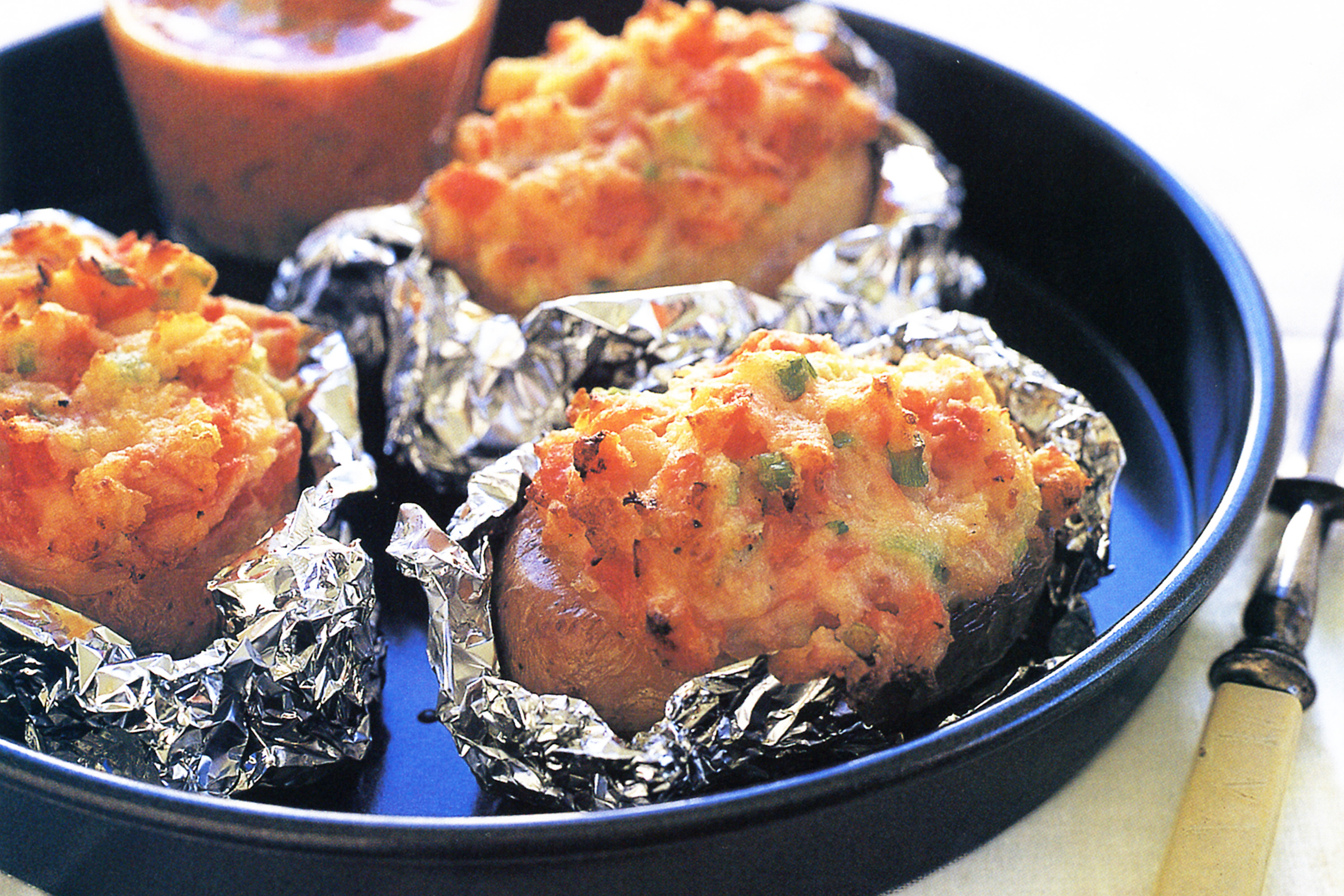 Cartofi copți, umpluți cu șuncă, roșii și parmezan