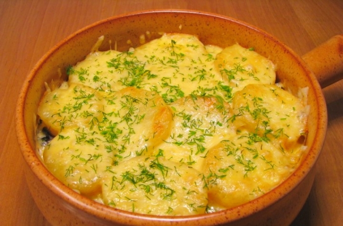 In ulcica se aranjeaza un strat de cartofi, se asezoneaza cu sare, piper si se unge cu smantana.