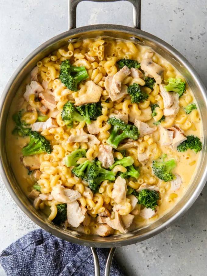 Adăugați pastele și broccoli și puiul marunțit în tigaie și amestecați pentru a le combina cu sosul de brânză. Serviți imediat.