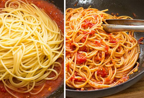 Intr-o tigaie se incalzeste sosul de rosii, se adauga pastele fierte si se amesteca pana sunt bine combinate.