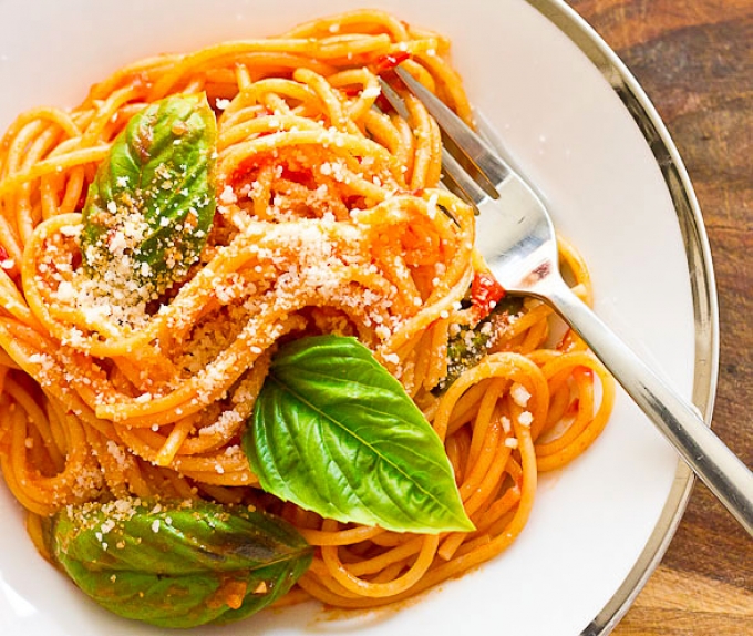 Paste in sos picant de rosii cu busuioc proaspat si branza