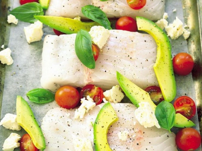 Pește copt cu brânză feta, avocado, roșii și busuioc