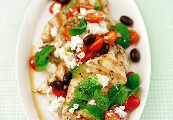 Cel mai rapid mod in care poti gati carnea de pui este pe un grill sau o tigaie de fonta pe aragaz. Rosiile proaspete si feta adauga o nota greceasca felului de mancare.