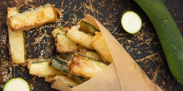 Fiecare felie de dovlecel se înmoaie în pane, se scutură excesul și se prăjește timp de 1-1,5 minute pe fiecare parte.
