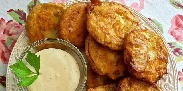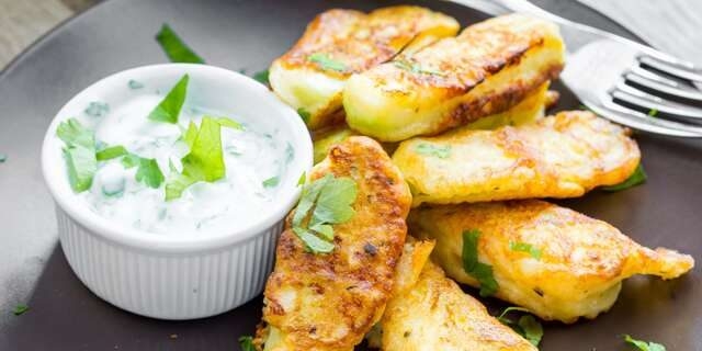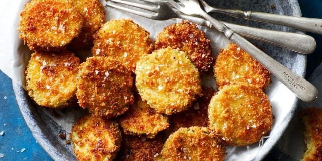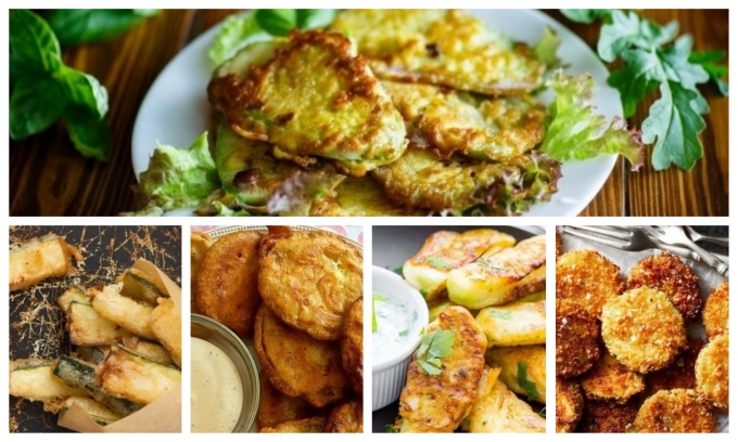 Fiecare rondelă de dovlecel se înmoaie în pane, apoi se prăjește timp de 1-2 minute pe fiecare parte.