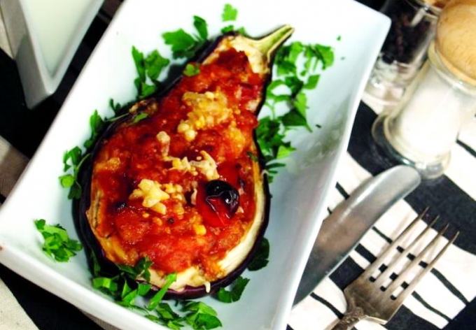 Umpli jumătățile de vinete cu amestecul răcorit puțin și dai la cuptor 20 de minute.