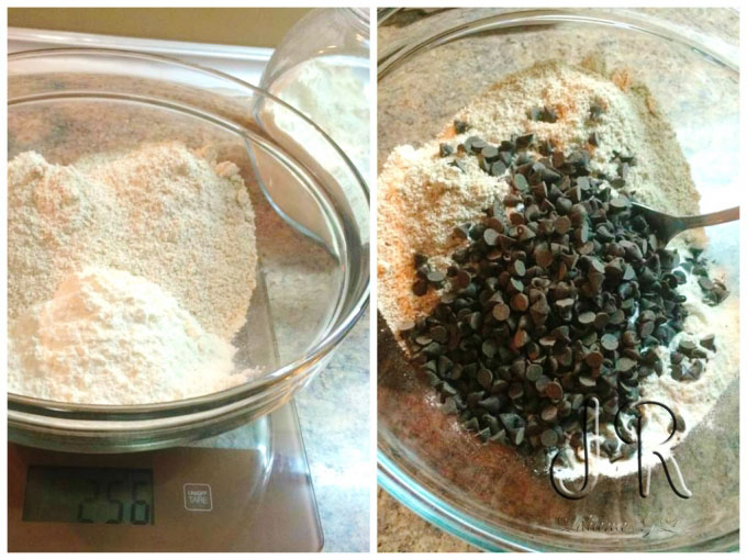 Amestecam faina cu praful de copt, bicarbonatul, fulgii de cocos si picaturile de ciocolata.