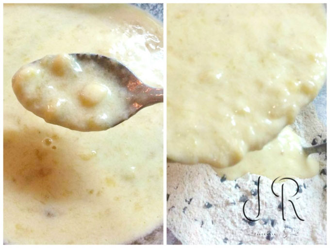Uniformizam cu o lingura. Turnam masa de banane in bolul cu faina si uniformizam cu lingura.
