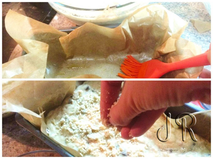Intr-o forma dreptunghiulara aranjam hartia de copt si o ungem cu ulei. Turnam aluatul si presaram arahide maruntite sau orice alte nuci.