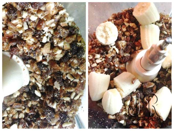 E timpul sa adaugam bananele, care vor inchega masa de fructe uscate.