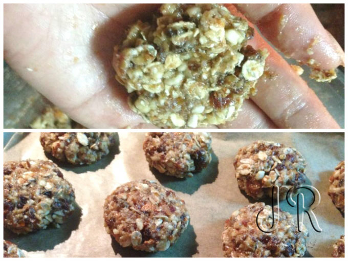 Modelam cu mainile biscuitii si-i asezam intr-o tava tapetata cu hartie de copt.