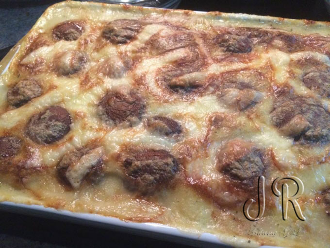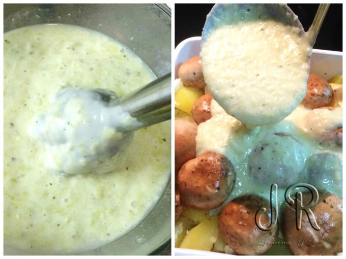 Intre timp, sosul de praz s-a racit. Il turnam intr-un bol si-l mixam cu blenderul, pana obtinem o textura omogena. Condimentam cu nucsoara rasa si turnam sosul peste cartofi si ciuperci.