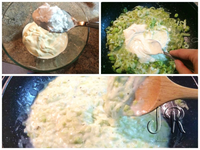 Intr-un bol amestecam smantana cu 2 linguri de amidon de porumb. Cand s-a inmuiat bine prazul, micsoram focul si turnam amestecul de smantana si amidon.