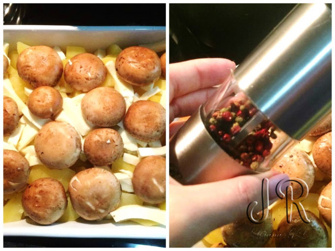 Spalam ciupercile si le punem peste cartofi cu coditele in jos. Ingredientele le condimentam cu amestec de piper macinat.