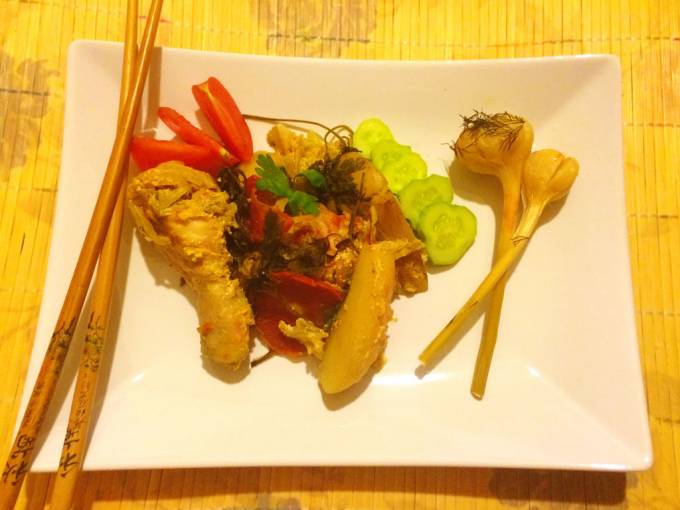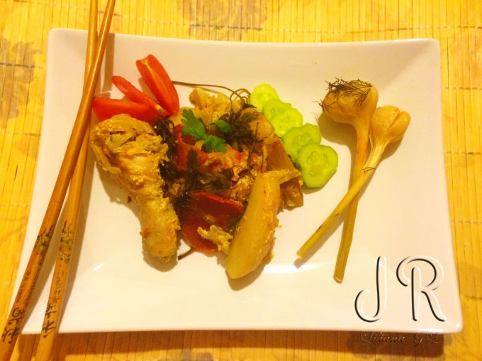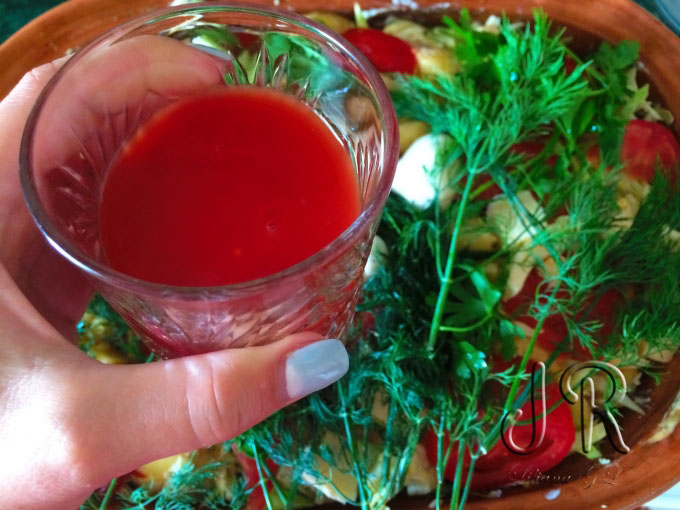 Deasupra aranjam cateva felii de unt, rondele de rosii, fire de marar si patrunjel, cuisoare si usturoi ( taiati in patru capatina de usturoi, sa-i oferim posibilitate aromei sa se plimbe prin oala ).