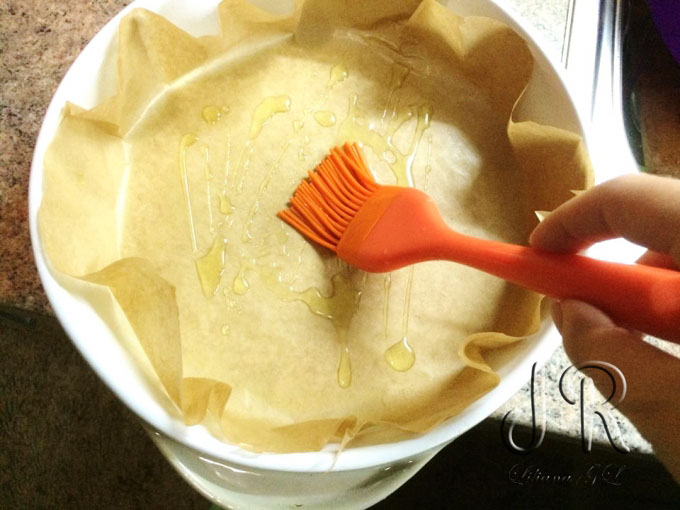 O forma rotunda pentru chec o tapetam cu hartie de copt si o ungem cu ulei.
