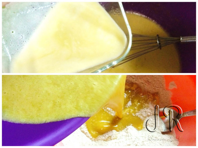 Apoi, incorporam untul si turnam masa lichida peste faina. Uniformizam bine cu o lingura, trebuie sa obtineti un aluat de consistenta unei smantani groase.