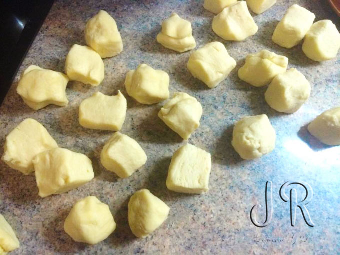 Ungem suprafata de lucru cu ulei, la fel si mainile. Fiecare bucatica de aluat o rotim cu palma de masa ca sa modelam o biluta.