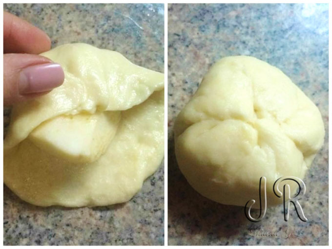 Merele le curatam de coaja si cotor, le taiem in 4 daca sunt mari sau in 2 daca sunt mai mici. Pe fiecare turtita asezam cate o bucata de mar si o "impachetam" frumos.