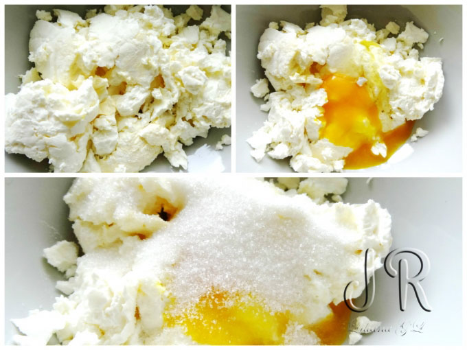 Preparam umplutura: intr-un bol amestecam branza, oul si zaharul.