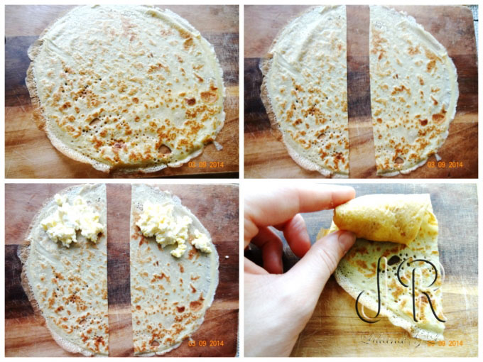 Taiem clatita in jumatate, punem o lingurita de umplutura si rulam.