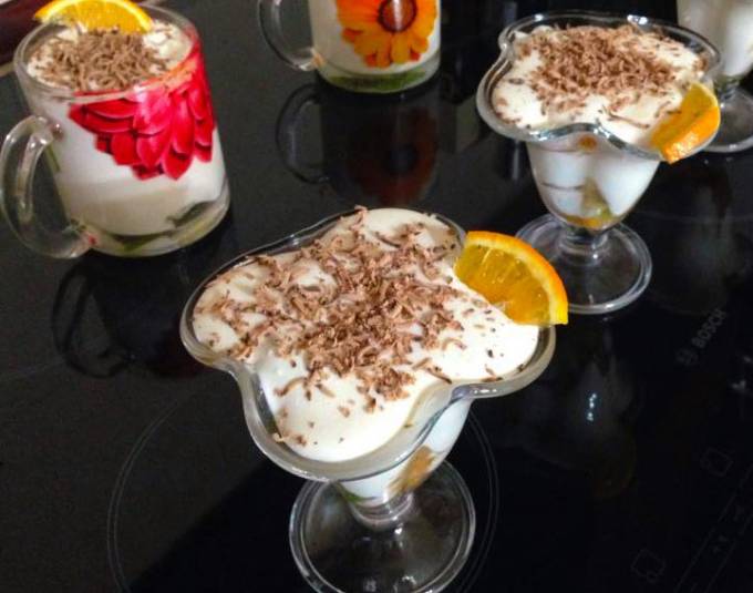 In cupele pentru desert se aranjeaza in straturi fructele si crema. Ultimul strat trebuie sa fie de crema.