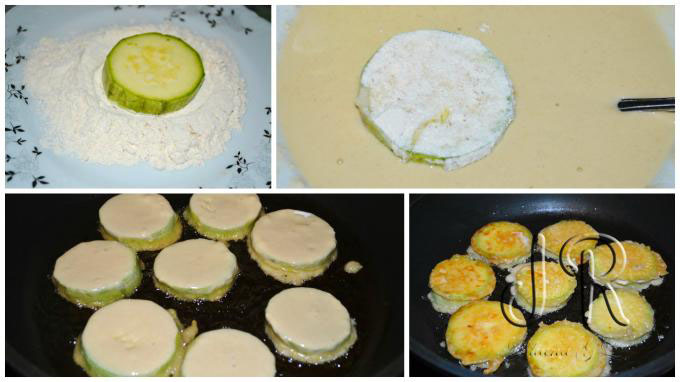 Feliile de dovlecel le trecem prin faina, apoi prin mixul obtinut si ii prajim pe o tigaie cu ulei incins in prealabil.