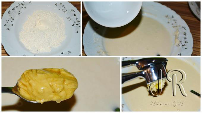 Intr-un bol punem cateva linguri de faina, turnam apa incet si amestecam pana obtinem o compozitie fara cocolase, adaugam mustarul, usturoiul si sarea.