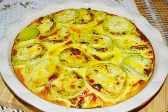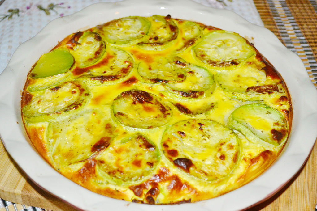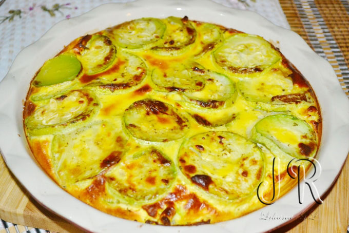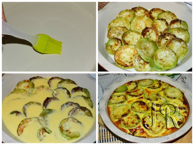 Aranjam feliile de dovlecel intr-un vas termorezistent uns cu ulei. Turnam peste dovlecel 1/2 compozitia obtinuta, apoi aranjam un alt strat de dovlecei si turnam restul compozitiei. Dam la cuptorul preincalzit pentru 20-25 minute sau pana se incheaga sosul.