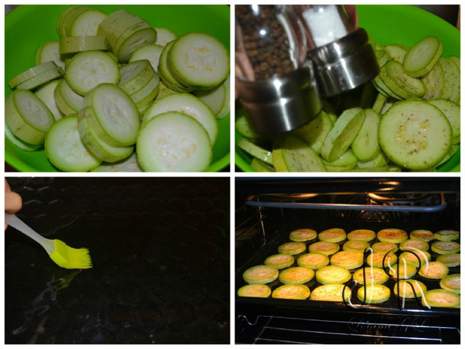 Ungem tava de copt cu ulei si aranjam feliile de dovlecel. Dam tava la cuptor pentru 15 minute.