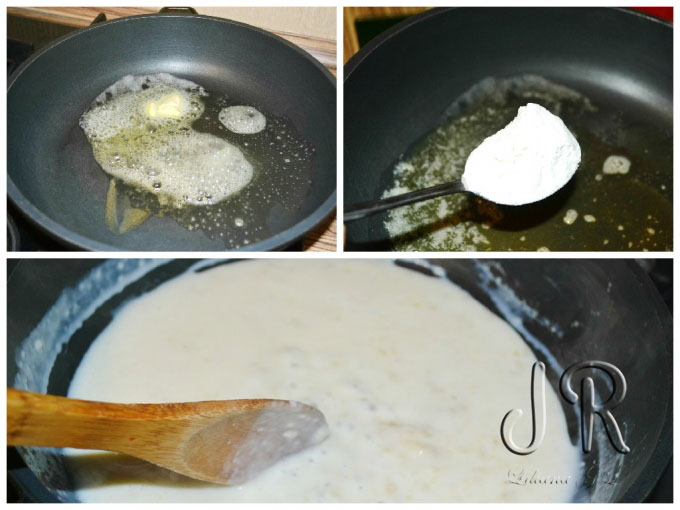 Topim o lingura de unt, adaugam o lingura de faina si amestecam. Turnam treptat laptele, amestecam continuu pana sosul devine usor ingrosat, aproximativ 2-3 minute. Sosul obtinut il lasam putin sa se raceasca.