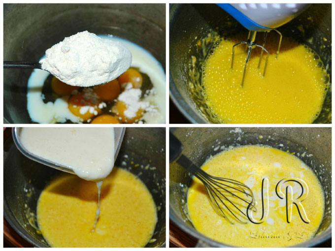 Intr-un bol amestecam ouale cu 1 cana de lapte si o lingura de faina.