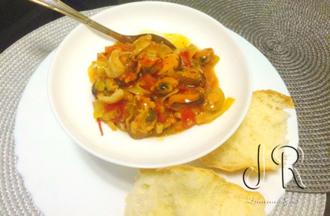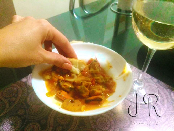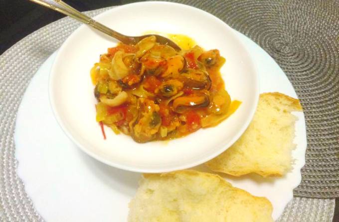 Fructele de mare in sos de rosii si vin sunt perfecte cu orez, paste sau cartofi natur. Dar cateodata ai chef sa nu le "alterezi" cu nici o alta aroma sau textura si atunci le savurezi cu o bucata de paine alba muiata in sosul delicat!