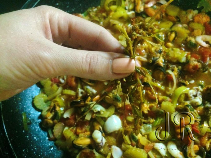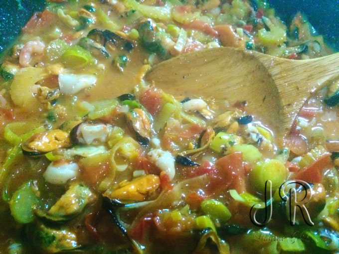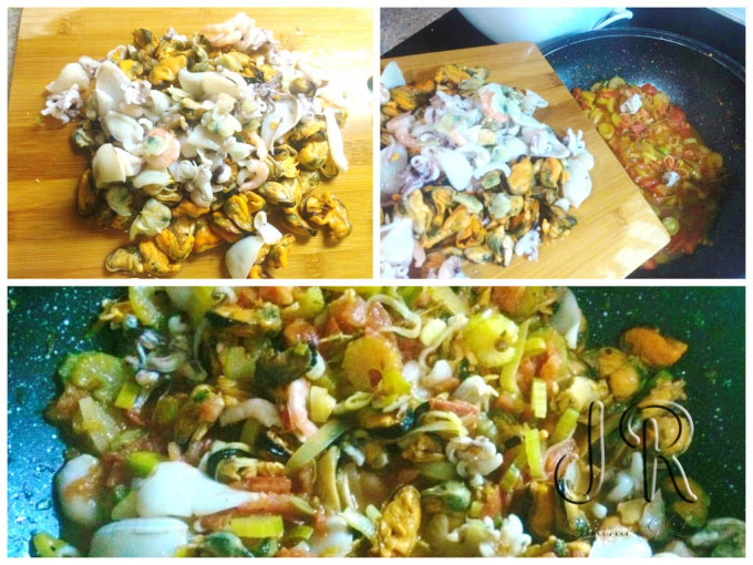 Intre timp, spalam bine fructele de mare si curatam midiile de "barba" si le adaugam in sos.