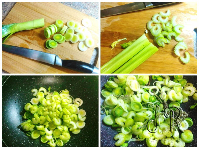 Intr-o tigaie incinsa unsa cu ulei punem prazul taiat inele si telina - felioare. Asezonam cu sare, piper rosu si crengutele de cimbrisor.